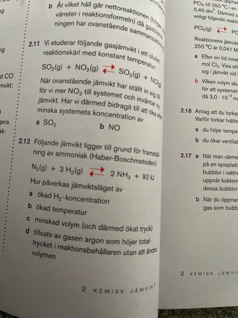 Hej! Jag behöver ha hjälp med uppgift 2.12 b och d. I b så undrar jag hur det kommer sig att reaktionen blir endoterm? Och hur kommer det sig att reaktionen förskjuts till vänster?