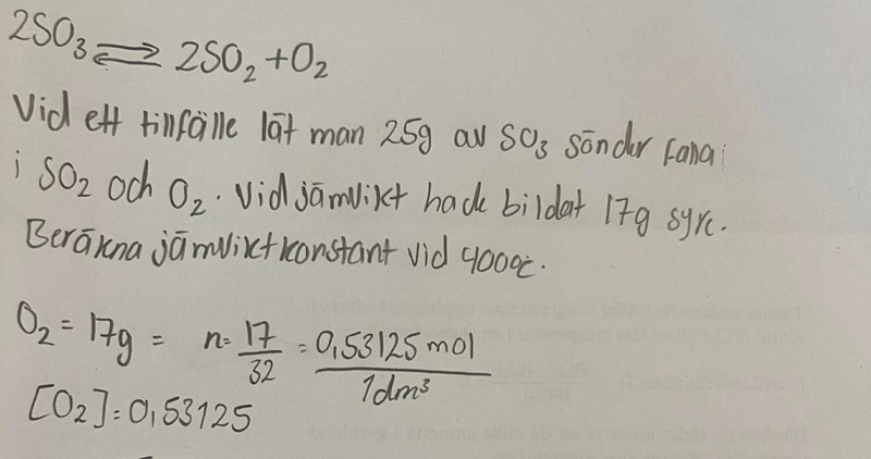 Smaragdalena skrev:Hur många mol SO3 fanns det från början? Hur många mol syrgas har det bildats vid jämvikt? Hur många mol SO2 har det bildats samtidigt? Hur många mol SO3 finns kvar vid jämvikt?