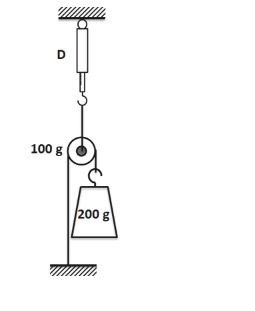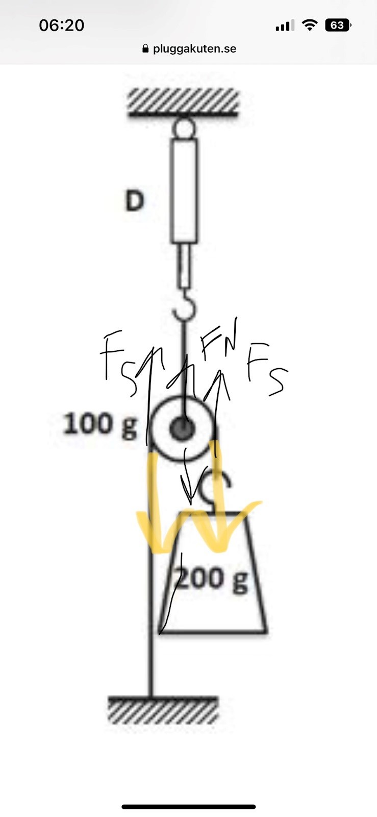 Det innebär att på kroken, som håller triss och vikt uppe, finns det en uppåtriktad kraft som är summan av de två de nedåtriktade krafterna: trissans tyngdkraft samt 200[g]-viktens tyngdkraft