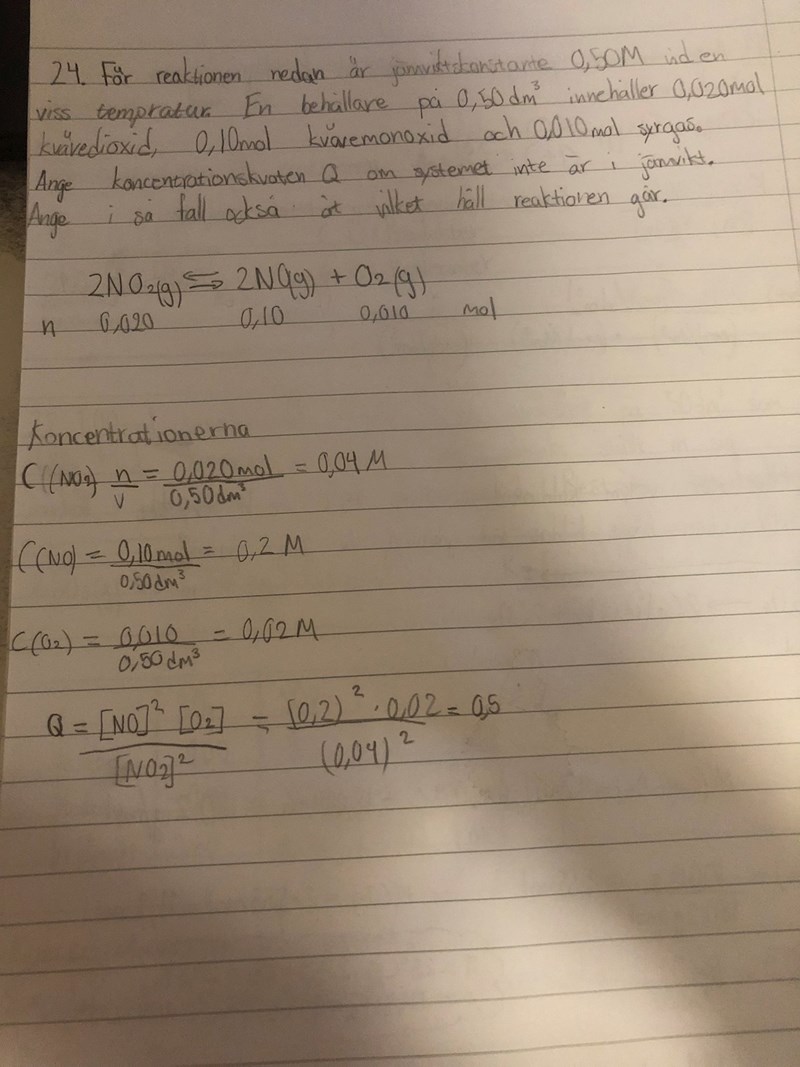 Behöver hjälp med uppgiften ovan. Jag började med att beräkna koncentrationen på de olika ämnena och därefter beräknade jag koncentrationskvoten Q. Men Q blev lika mycket med M, och systemet ska ju inte befinna sig i jämvikt.