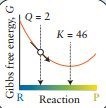 Du kan tänka dig en positiv andragradsfunktion där minimum är jämviktsläget, dvs K. Detta motsvarar den lägsta energin för reaktionen, vilket sammanfaller med jömviktsläget. Om Q < K kommer Q vara till höger om K och "åka nerför backen" mot K (till höger), dvs fler produkter bildas. Om Q > K kommer Q vara till höger om K och "åka nerför backen" mot K (till vänster), dvs fler reaktanter bildas. Se bild nedan. R = reaktanter. P = produkter. "Gibbs free energy" är ett mått på energi men det behöver du inte fördjupa dig i om du inte vill!