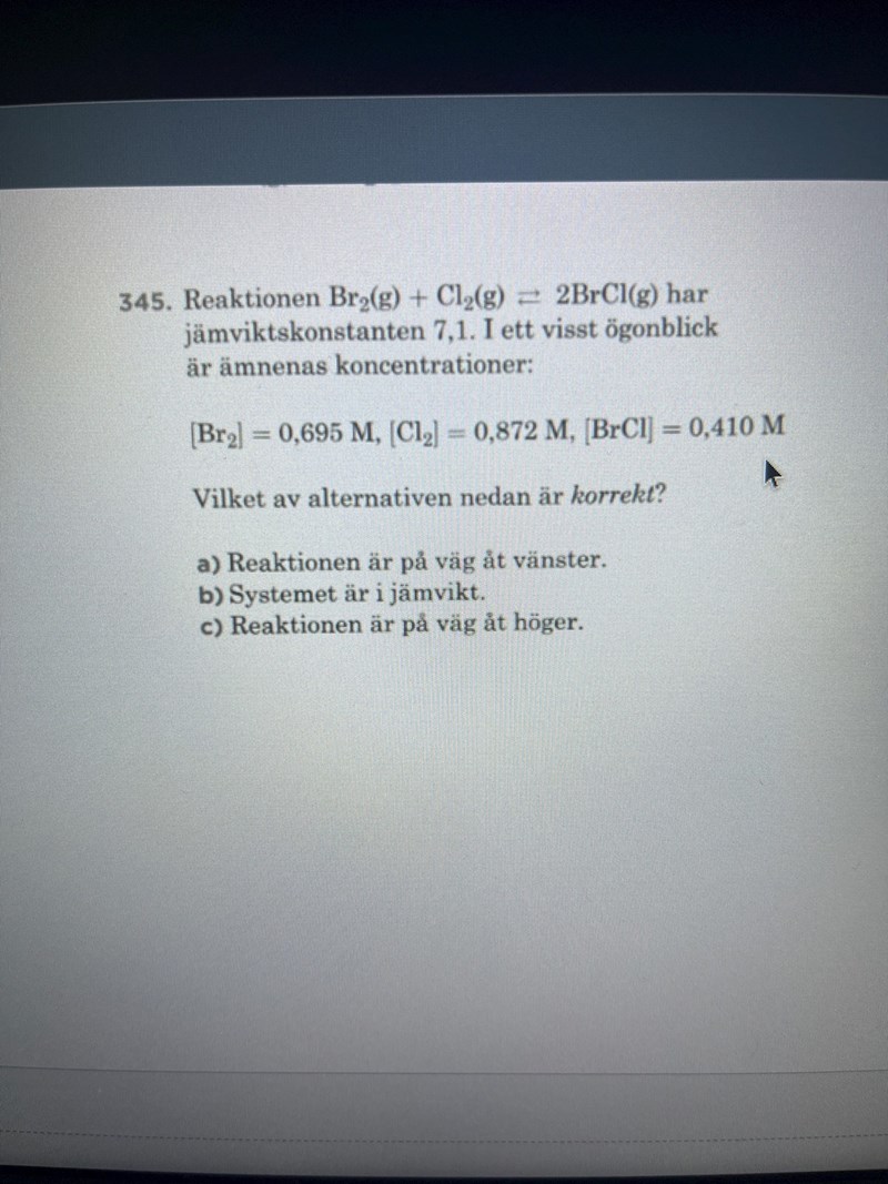 Du har beräknat koncentrationskvoten Q, det vill säga kvoten vid ett visst tillfälle när reaktionen inte nödvändigtvis är vid jämvikt. Om Q = K så är reaktionen vid jämvikt. Om Q < K så kommer reaktionen fortgå mot produkter. Om Q > K så kommer reaktionen fortgå mot reaktanter.