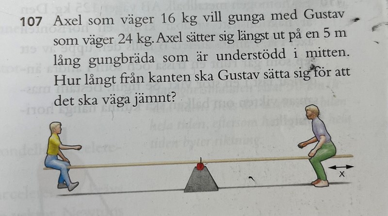 Hej jag skulle behöva hjälp med denna uppgiften! Jag började med att räkna ut deras kraft genom att ta m x g och fick då 157,12 N och 235,68 N men sen vet jag inte hur jag ska gå vidare. Hjälp uppskattas!