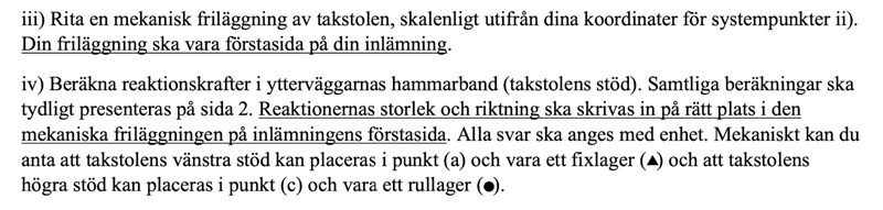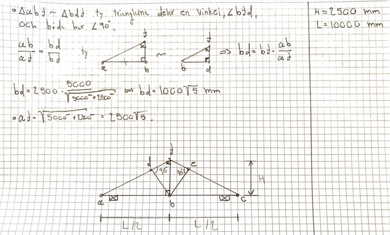 Dessvärre är inte alla koordinaterna korrekta. Gör som det står i anvisningarna och rita konstruktionen skalenligt. Taklutningen skall vara vara 27˚, dvs arctan(v) = 1/2. Man luras av att den skissade takstolen inte är skalenligt ritad. Dina d- och e-koordinater ligger högre än nock-koordinaten f!