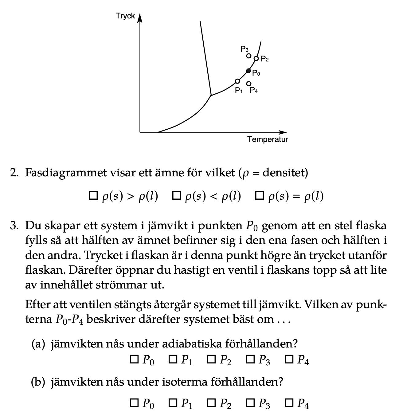 På fråga 3 så undrar jag hur man ska tänka. Adiabatiskt betyder ju att dq=0 och isotermt betyder att dT=0. Ska man tänka att det är en adiabatisk expansion av gas eftersom trycket är större ute än inne och att temperaturen då sjunker och hamnar på p1 för a)? Sedan vid en isoterm expansion så övergår jämvikten istället i p0?