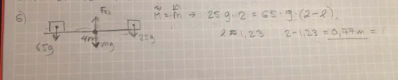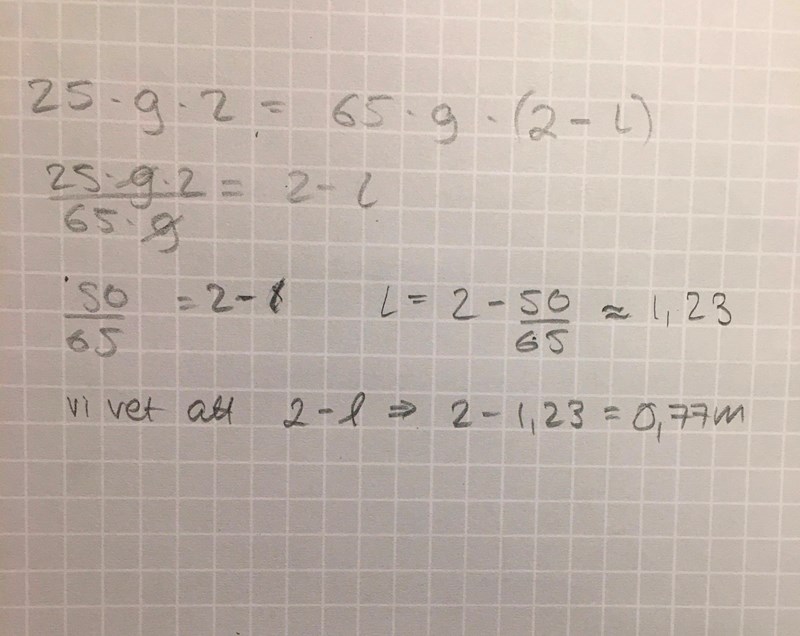 Momentekvationen blir då helt enkelt 2•25g = l•65g
