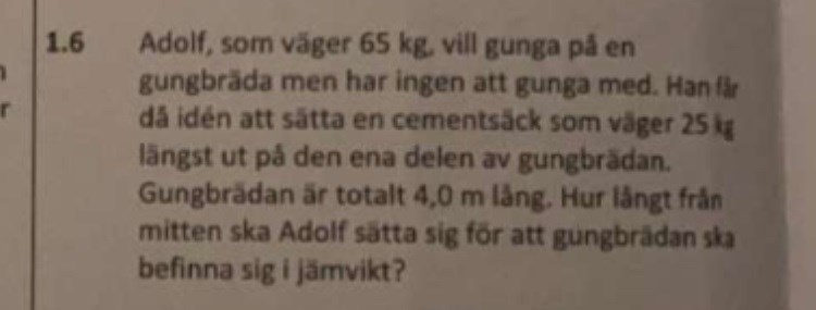 Ett tips för enklare beräkningar är att låta den obekanta storheten l beteckna avståndet mellan vridpunkten och Adolf.