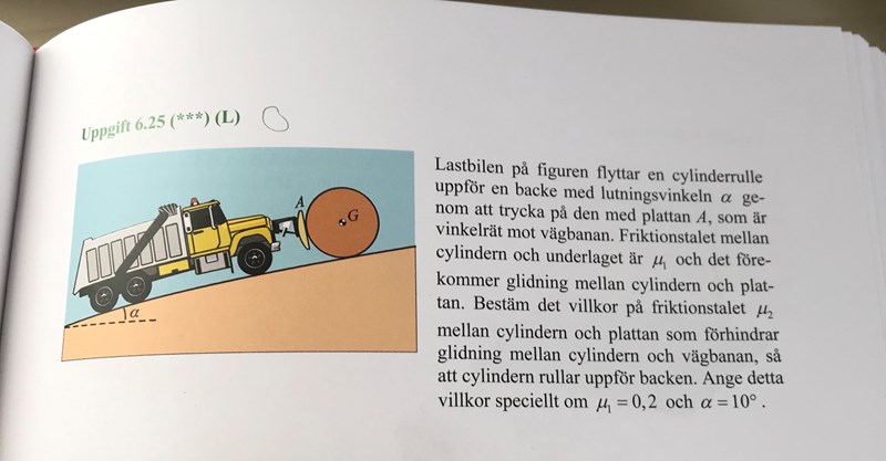 Det jag inte förstår här, liksom i många andra uppgifter, varför man utgår från att jämvikten i krafter i x-led inte kan brytas först, utan att cylindern först förflyttas när momentjämvikten bryts. Och hur kan man egentligen utgå från att kraftsumman i x och y med måste vara noll precis i det ögonblicket som det är precis på gränsen att cylindern roterar?