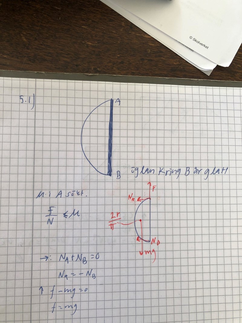 Man kan rätt enkelt se rent mekaniskt att om inte ringen fanns vid B, skulle halvcirkeln rotera moturs runt A (på grund av tyngdens hävarm). Därmed måste vara åt vänster. Sedan blir det en smal sak att ta fram korrekt riktning för .