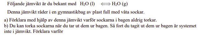 a. För att sockarna ska torka måste jämvikten förskjutas åt höger. När jämvikten ställde in sig så anpassade den sig till rådande förhållanden i gymnastikbagen (tryck, temperatur m.m.). Eftersom det inte finns något som stör jämvikten i gymnastikbagen så kommer jämvikten att bestå, det vill säga jämvikten förskjuts inte åt höger; den består. Därför kommer sockarna inte att torka. Kanske är jag återigen ute och cyklar