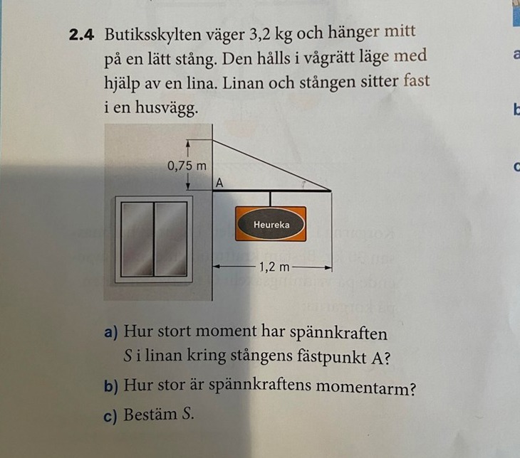 Lösningsförslag som erbjuds visar följande : Spännkraften S i linan har lika stort kraftmoment moturs som skyltens tyngd har