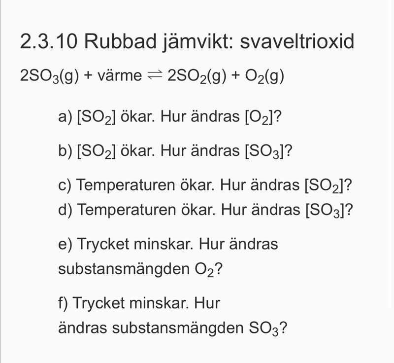 hej. Jag har svårt att förstå fråga C. Tydligen ökar SO2 när temperaturen ökar. Är det inte så att efrersom att värme ligger hos SO3 så kommer det bli mindre hos den sida? isåfall varför höjs SO2? Och ifall det ökar hos SO2, betyder det då att det också ökar hos O2?