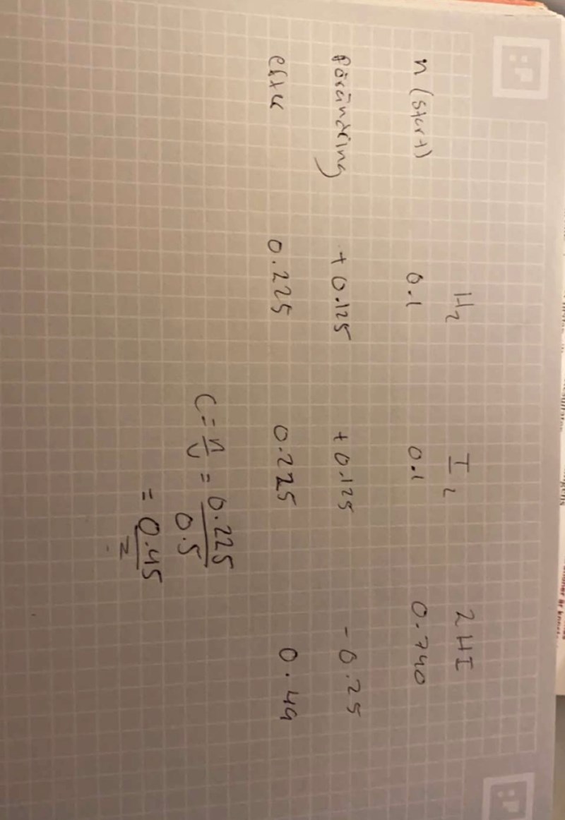 I ett kärl med volymen 500 cm3 finns en jämviktsblandning bestående av 0,100 mol vätgas, 0,100 mol jodånga och 0,740 mol vätejodid. Reaktionen för jämvikten är