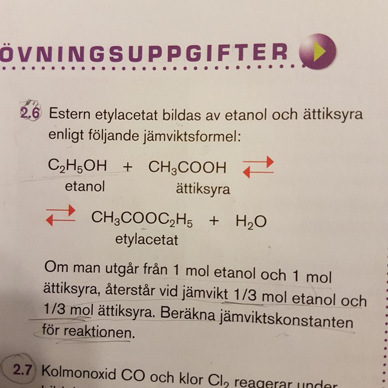 Om man har 1 mol etanol och 1 mol ättiksyra vid start, och det finns kvar 1/3 mol av vardera vid jämvikt, hur mycket finns det då av etylacetat respektive vatten vid jämvikt?
