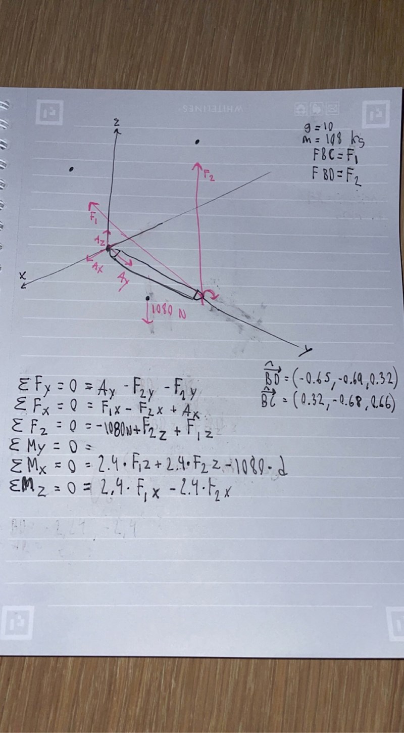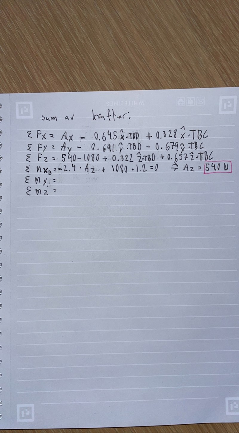 jag har nu lyckats ta fram Az iallafall genom att ta momentet i punkt B runt x axeln. Såhär ser det ut just nu, nått tips på hur jag kan ta mig vidare? Har även tagit fram riktingsvektorer för snörkrafterna TBC och TBD