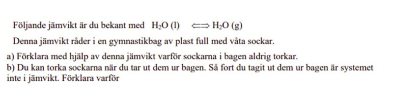 Hej! Jag förstår inte hur jag ska tänka här. Är det rätt att i a uppgiften tänka på följande sätt -> Att det kommer ske en jämviktsreaktion gör sockarna aldrig torkar..? Vet inte hur jag ska tänka här.