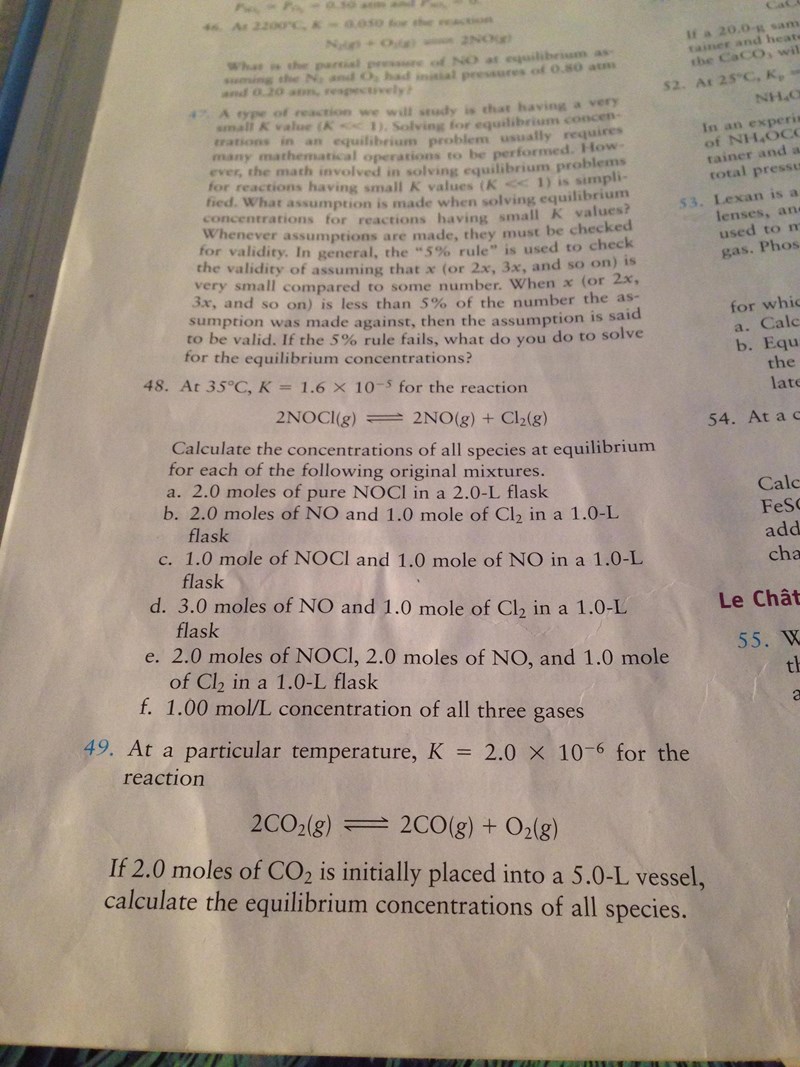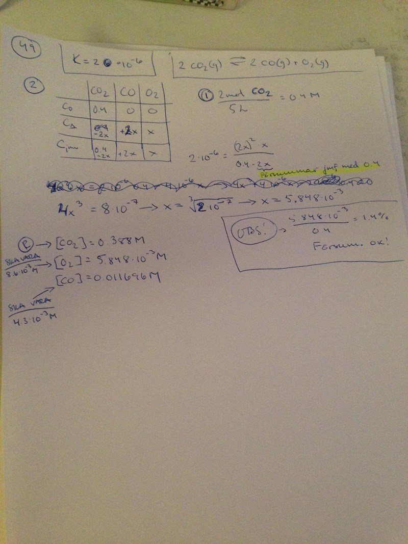 en fråga dock: om du kollar i kanten vid koncentrationerna jag skrivit där det står "ska vara". Är det rimligt att jämviktskoncentrationen är två gånger mer för O2 än CO när reaktionen ser ut som den gör uppe i högra hörnet? Det är ju dubbelt så många mol CO som O2.