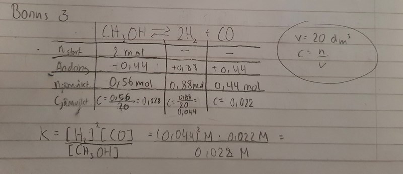 En behållare på 20,0 dm^3 fylldes med 2,00 mol metanol. Vid jämvikt fanns 0,44 mol kolmonoxid. Vilken är jämviktskonstanten?