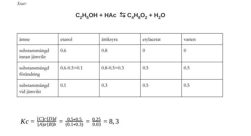 Man blandar 0,6 mol etanol med 0,8 mol ättiksyra. Sedan jämvikt ställt in sig finner man att det bildats 0,5 mol etylacetat och 0,5 mol vatten. Beräkna jämviktskonstanten för reaktionen.