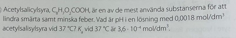 Hej! Jag undrar varför det står 0,0018-x mol (vid jämvikt) i tabellen. Det står i uppgiften att ämnets koncentration i lösningen är 0,0018 mol/dm³ vilket jag tolkar tolkar som jämviktskoncentrationen. Hur vet man utifrån hur frågan är ställd att den är mindre?