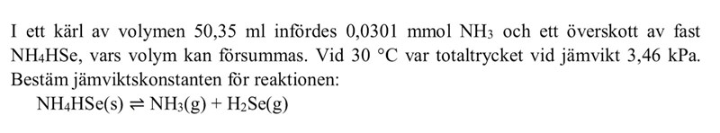 Smaragdalena skrev:sedan är väl konstanten koncentrationerna/partialtrycken multiplicerat med varandra eftersom man ej räknar med NH4Se