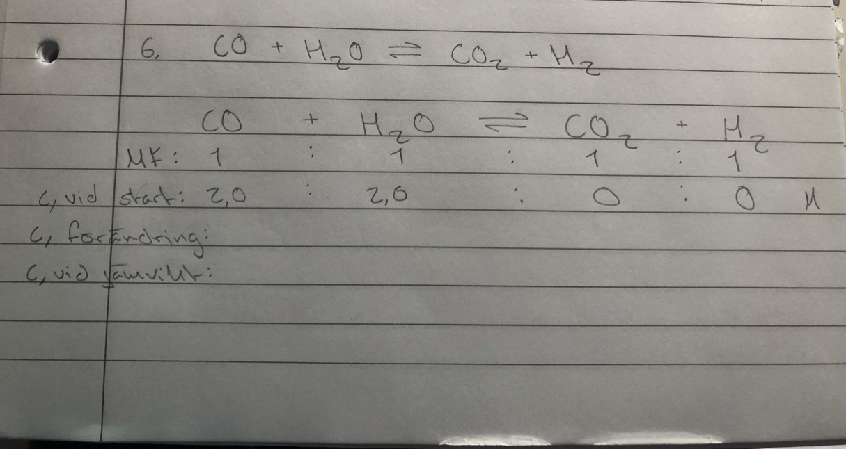 "I en behållare fanns vid reaktionens start kolmonoxid (2,0 M) och vattenånga (2,0 M). Dessa upphettades till 500 grader (K = 5,9). Efter en stund ställde följande jämvikt in sig: