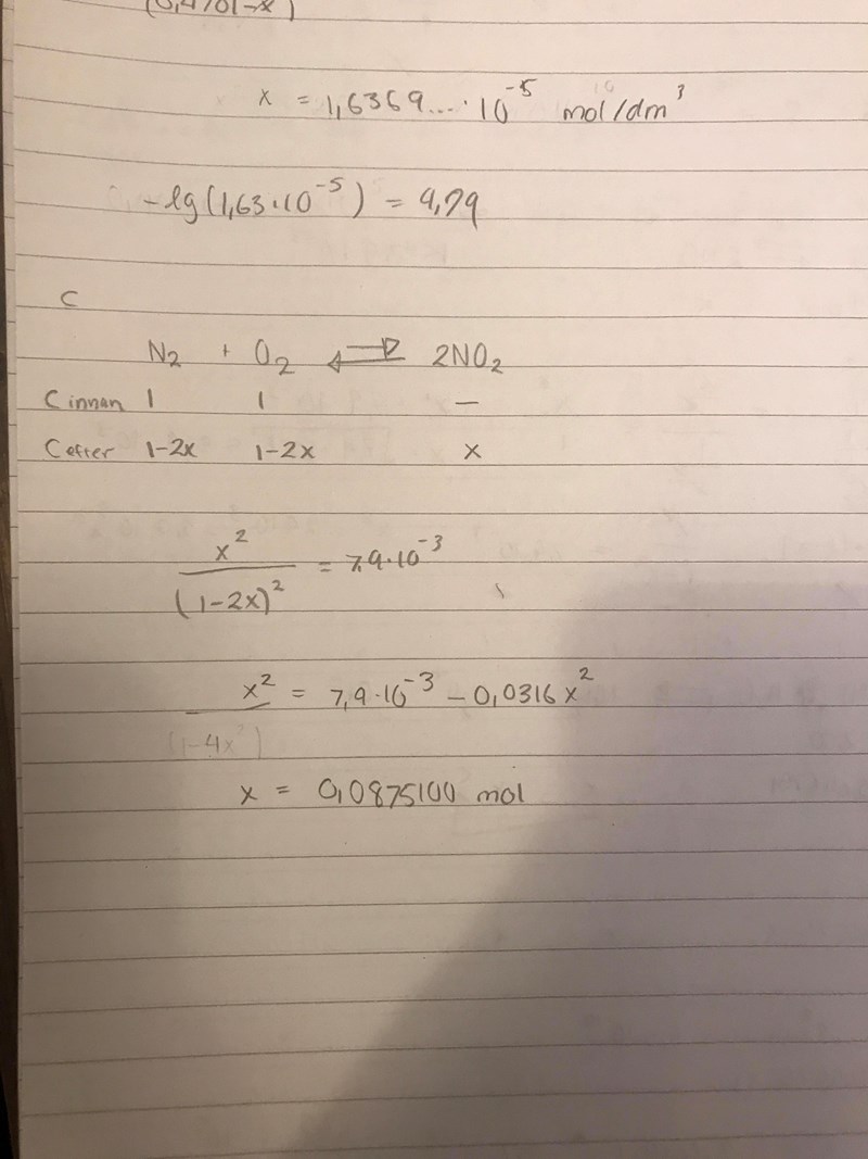 Du har inte tagit hänsyn till att det har förbrukats kvävgas och syrgas vid reaktonen. Hur mycket kvävgas har det förbrukats, om det har bildats x mol NO?