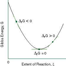 Reaktionen strävar efter att minimera den fria energin, eller annorlunda uttryckt - orsaka en så stor entropiökning hos universum som möjligt. Det sker när reaktanter och produkter har en viss koncentration som motsvarar jämviktsläget.