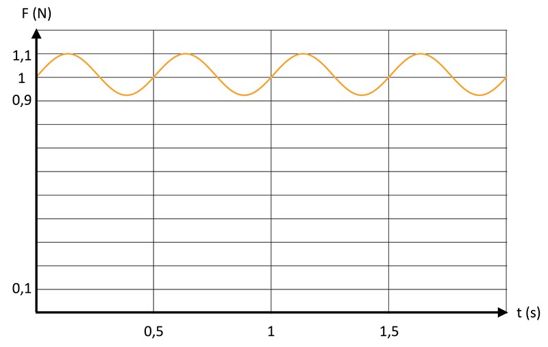 Kraften ÄR 1 N i jämviktsläget. I det övre vändläget är kraften 1,1 N, in det undre vändläget är den 0,9 N.