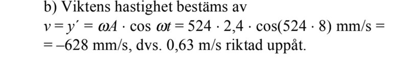 Vinkelhastigheten = 2pi/T vilket avrundat blir 524. Men man kan inte använda det avrundade värdet, räknar man i radianer är det stor skillnad på 524 och 523,5988. Väldigt förvirrande att facit använder 524. Och att de sätter in tiden t=8 är ännu mer förvirrande eftersom de inte motiverar varför de byter tecken på uträkningen (positivt är ju uppåt).