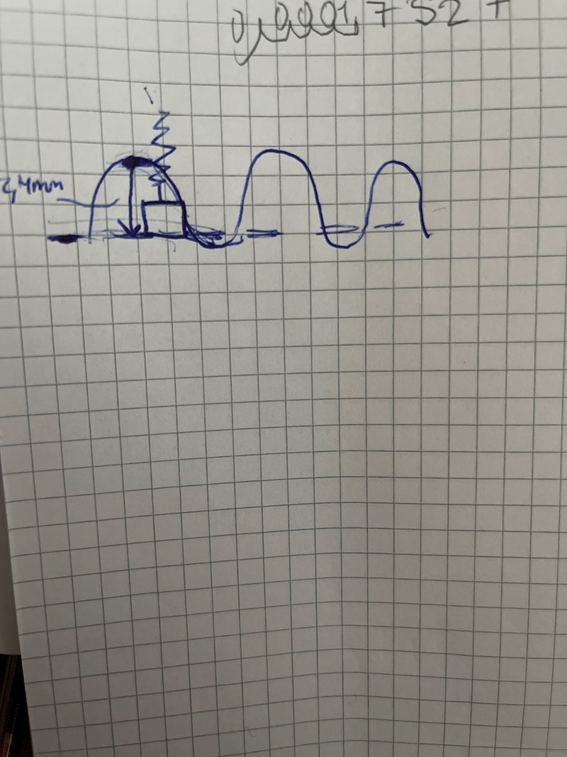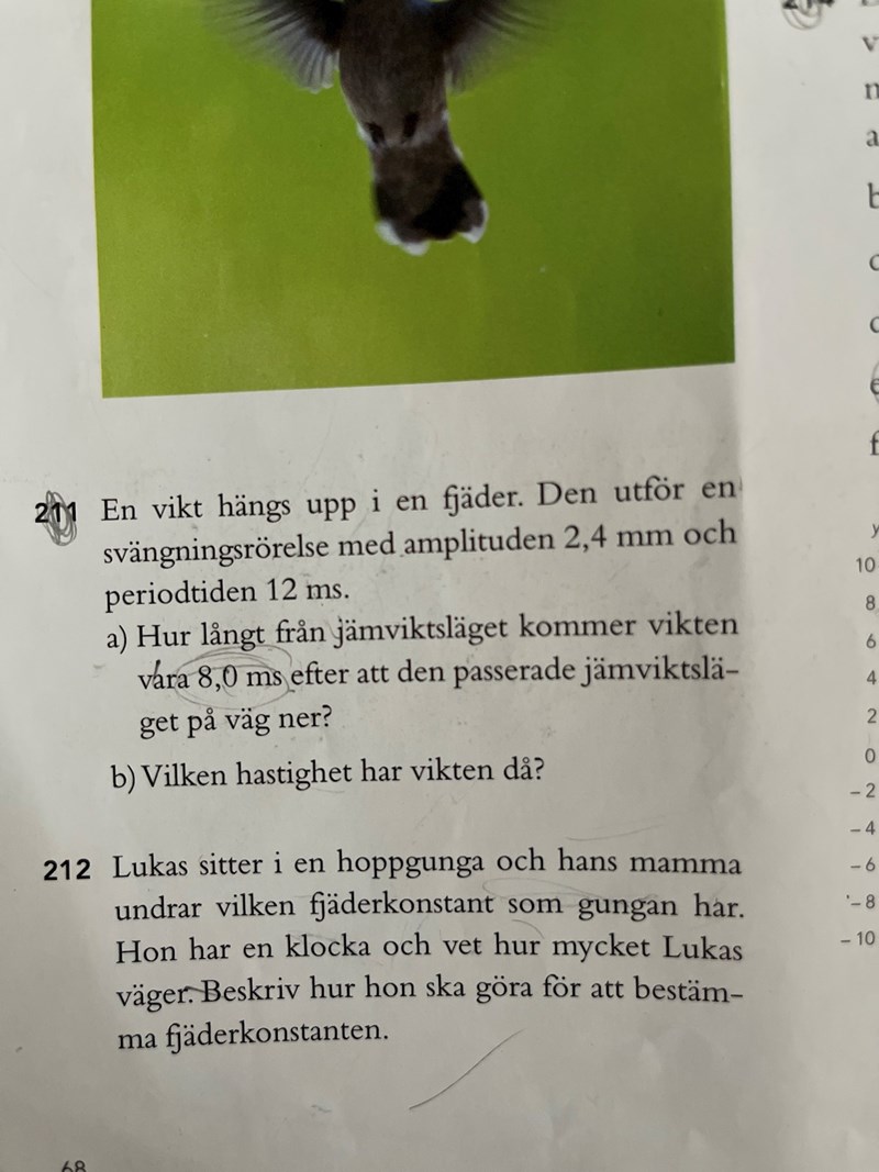 Menar du att efter 6ms har fjädern passerat jämviktsläget? Jag förstår inte hur du menar? Varför är det så?hur kom du fram till sinusfunktionen/grafen?