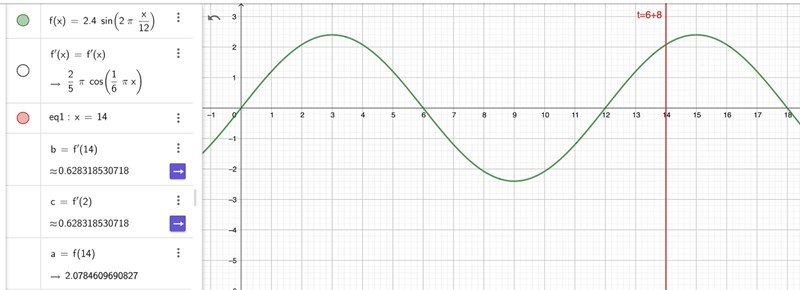 Alternativt räknar du y'(14-12)=y'(2) eftersom perioden är 12.” .. Varför tar du 12/2 och varför  är t=6+8?  Jag förstår inte :(