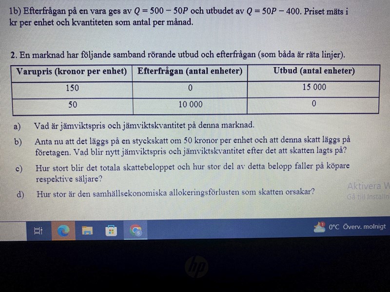 Hej! Jag är på fråga 2.a. Behöver hjälp med hur jag ska tolka sambandet i tabellen och sedan använda det när jag ska bestämma jämvikt i pris och kvantitet. Antar att jag ska bestämma två räta linjer enligt y=kx+m. Men hur!?