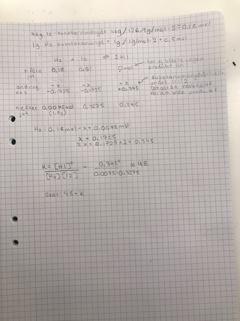 𝐻2(𝑔) + 𝐼2(𝑔) ↔ 2𝐻𝐼 (𝑔) ställer in sig. I jämnviktsblandningen finns 1,9 g jod. Beräkna jämnviktskonstanten.