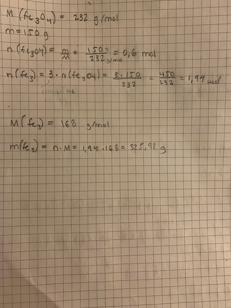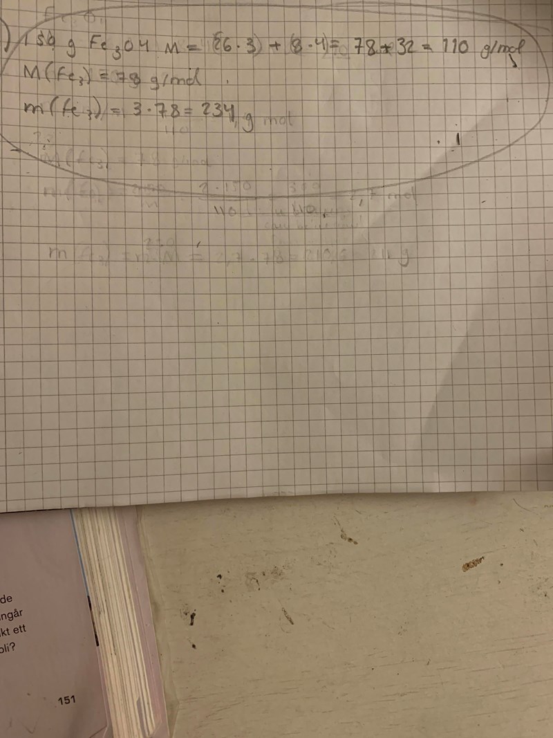 Det verkar som om du har räknat molmassan med atomnumret, inte molmassan som du borde. Molmassan för Fe3O4 är 3*56+4*16 = 232 g/mol ungefär. Hur många mol är 150 g magnetit?