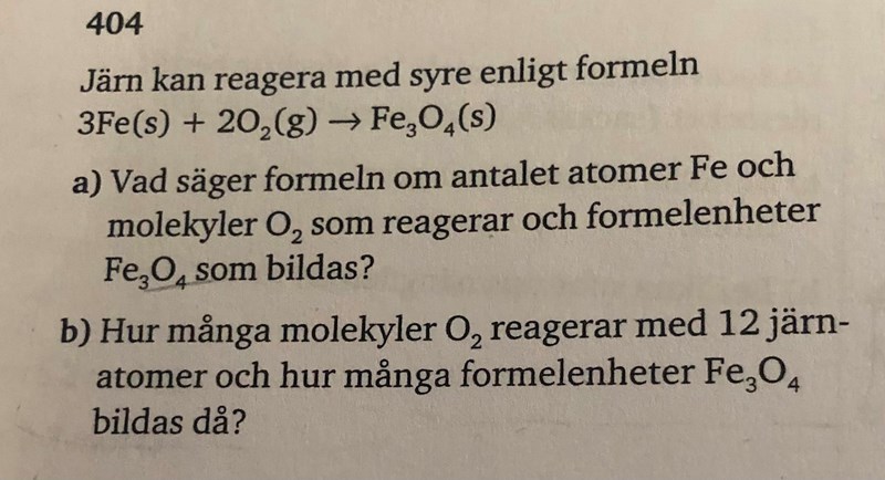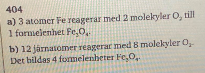 På a) så betyder det att tre järnatomer plus 2 syremolekyler (eller 4 syreatomer) reagerar och får 1 formelenhet Fe3O4?