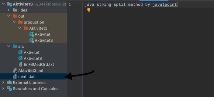 detta är textfilen som jag utgår ifrån och som innehåller texten "java string split method by javatpoint." (detta är ett exempel