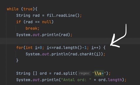 int l = filnamn.length(); System.out.println("Antal ord: " + l);Ja, det där är ju fel. Hur anropar man 'split', undrade jag.