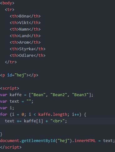 Hej, som jag tolkar frågan måste du använda dig av JavaScript objekt. Ett objekt är som en stor variabel som innehåller information. I ditt fall kommer du skapa ett objekt för en böna. Detta objekt ska ha information om dennes vikt, namn, land, arom, styrka och odlare. Du skapar ett objekt på följande sätt: