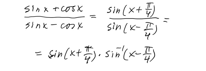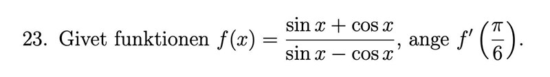 Jag vet inte om det är en genväg, men notera att sinx-cosx=-sinx+cosx'\sin{x}-\cos{x}=-\left(\sin{x}+\cos{x}\right)'. Så du letar efter derivatan av fx=-gxg'x\displaystyle f\left(x\right)=-\dfrac{g\left(x\right)}{g'\left(x\right)}. Kvotregeln ger f'x=...=gxg''xg'x2-1\displaystyle f'\left(x\right)=...=\dfrac{g\left(x\right)g''\left(x\right)}{\left(g'\left(x\right)\right)^2}-1 där gx=sinx+cosxg\left(x\right)=\sin{x}+\cos{x}. Om inte annat kanske bara en kul anmärkning.