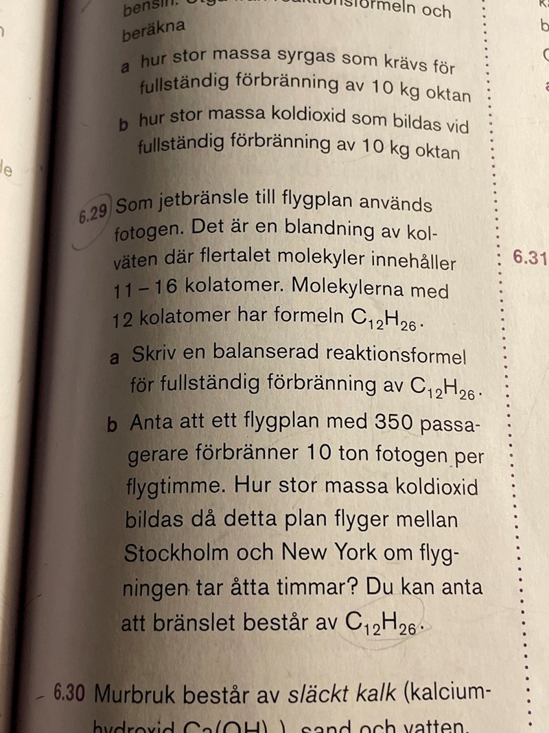 Vet inte hur jag ska glra för uppgift b) jag har skrivit att m(2C12H26) = 10 000 000g , n(samma) = m/M = 2366.8507mol. Sen har jag multiplicerat det med12 eftersom förhållandet mellan 24Co2 och 2C12H26 = 1:12, Det blev att n(24Co2) = 352402.2084