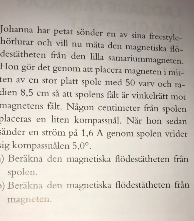 Om du ritar en bild där magnetfältet från samariummagneten pekar åt höger och magnetfältet från spolen pekar uppåt, så vet du att . Då kan du beräkna flödestätheten för samariummagneten.