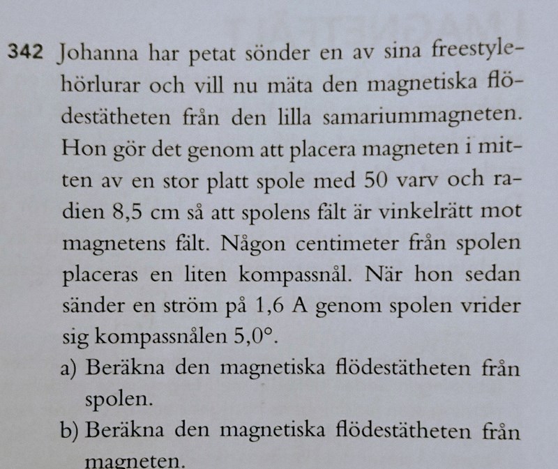 Uppgift b) har såklart nåt med vinkel att göra, och igenom mycket petandet hittar jag 0.59mT/tan(5°)=6,7mT som stämmer med faciten... Men jag verkligen har inga koll i vilka riktning ska magneten vrida sig. Alltså allt känns så flummigt.