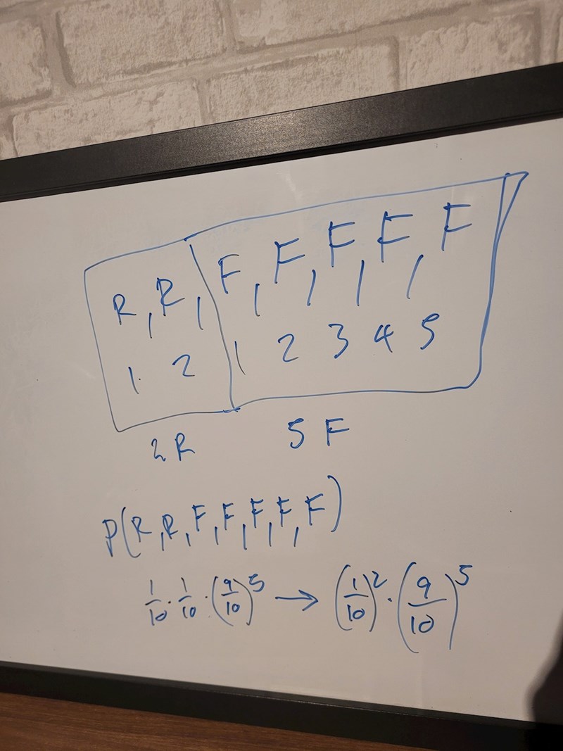 Man eftersöker dessa två specifika utfall. (R, R, F, *, *, *, *) och (*, *, *, *, F, R, R)?
