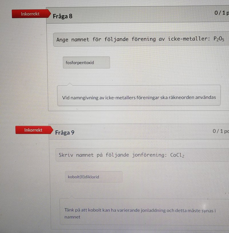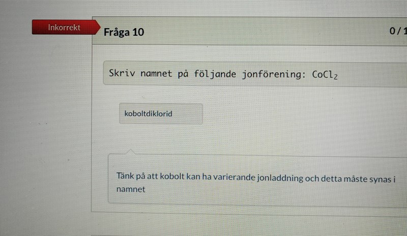 Det är alltså inte fel, utan det är programmet som inte fattar att flera svar kan vara rätt. Man kan kalla föreningen både för fosforpentoxid eller fosfor(V)oxid, respektive koboltdiklorid eller kobolt(II)klorid.