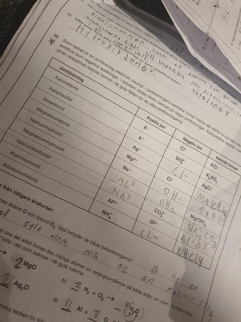 Du måste vara noggrann med stora och små bokstäver när du skriver kemiska formler. Natriumjonen är Na+, inte NA+, och det heter Mg2+, inte MG2. Hydroxidjonen är OH- och ingenting annat. Du behöver vara tydligare med upphöjda och nersänkta siffror - det heter Al2O3 med siffrorna där nere. Kloridjonen skrivs Cl-, och ammoniumklorid har fått fel formel. Det finns 4 väteatomer i en ammoniumjon, och ammoniumklorid består av en ammoniumjon och en kloridjon.