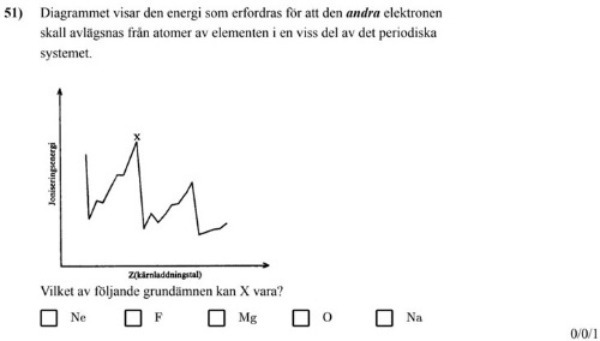 Ok, då kan jag utesluta F och O eftersom de hellre tar upp elektroner, och sedan Ne då det är en ädelgas. Det står mellan Mg och Na. Jag vet att det krävs mer energi att dra bort den andra elektronen hos båda atomerna, så hur ska jag veta vilken av dessa ämnen det är om jag inte vet något förhållande i diagrammet?