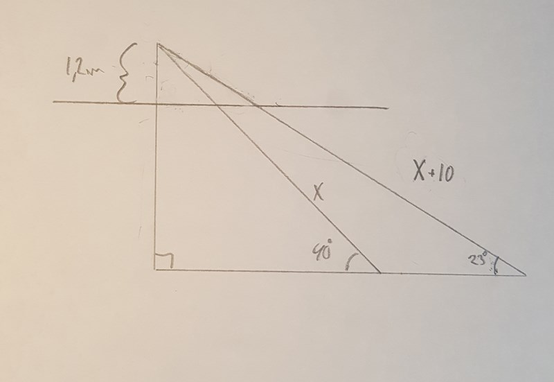 Jonny är i Norge och fiskar. Han kastar två linor. Den ena är 10m längre än den andra. Jonny kan även observera att vinklarna på linorna är 40° för end första och 23° för den andra. Han vet att avståndet mellan fiskspöarna och vattenytan är 1.2m.