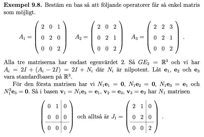 Jag förstår ju att vi delar upp A_1 i en diagonalmatris med dess egenvärden på diagonalen och kvar får vi en Nilpotent matris. Jag förstår även beräkningarna sedan men konstruktionen av basen förstår jag inte riktigt. Jag ser int den röda tråden. Varför är till exempel? Och om jag bara accepterar basen som den är, hur får jag N_1? Min spontana tanke var:Givet basen så är