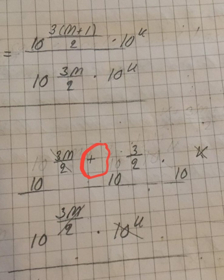 Bättre. Nu är jag nästan nöjd. Nu saknar jag bara att du byter ut det felaktiga plustecknet (rödmarkerat) mot ett multiplikationstecken i höjd med täljarens faktorer.